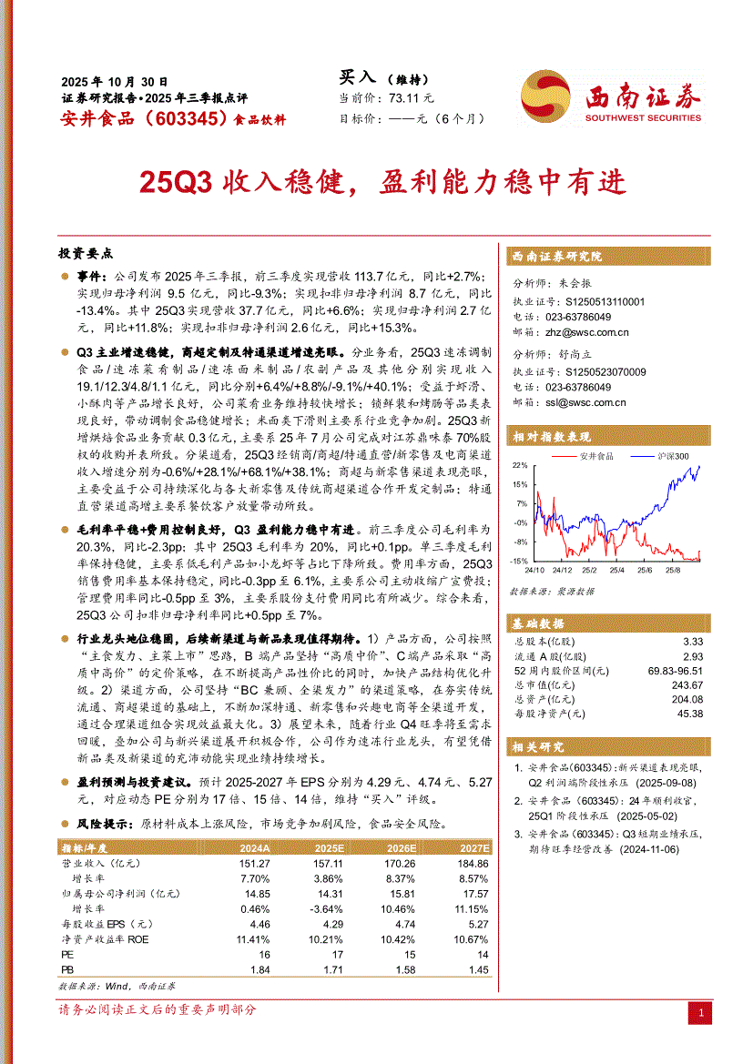 西南证券-安井食品-603345-2025年三季报点评:25Q3收入稳健,盈利能力稳中有进-251030