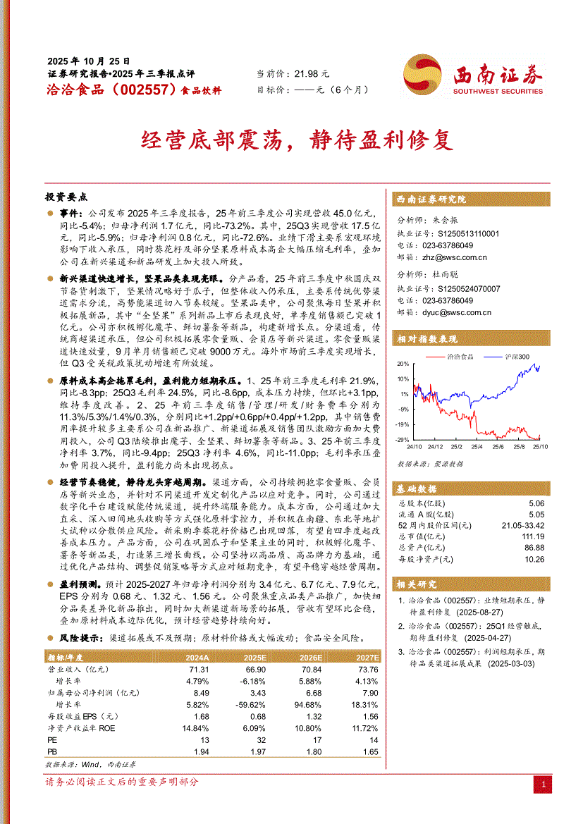 洽洽食品研报:西南证券-洽洽食品-002557-经营底部震荡,静待盈利修复-251025