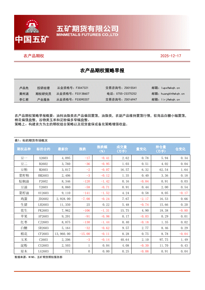 研报:五矿期货-农产品期权策略早报-251217