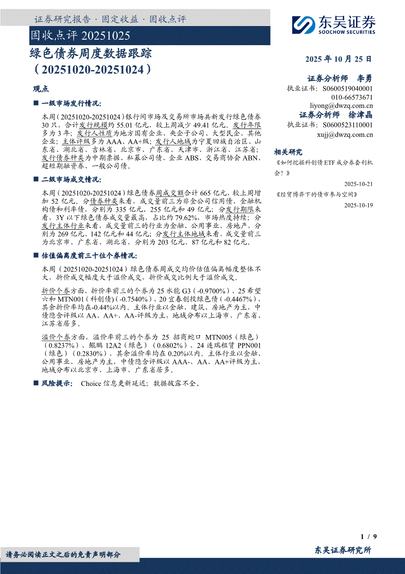 研报:东吴证券-固收点评:绿色债券周度数据跟踪-251025