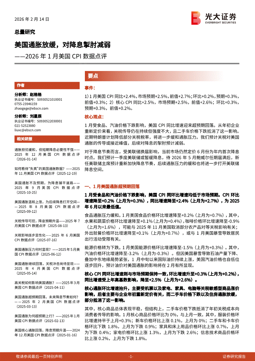研报:光大证券-2026年1月美国CPI数据点评:美国通胀放缓,对降息掣肘减弱-260214