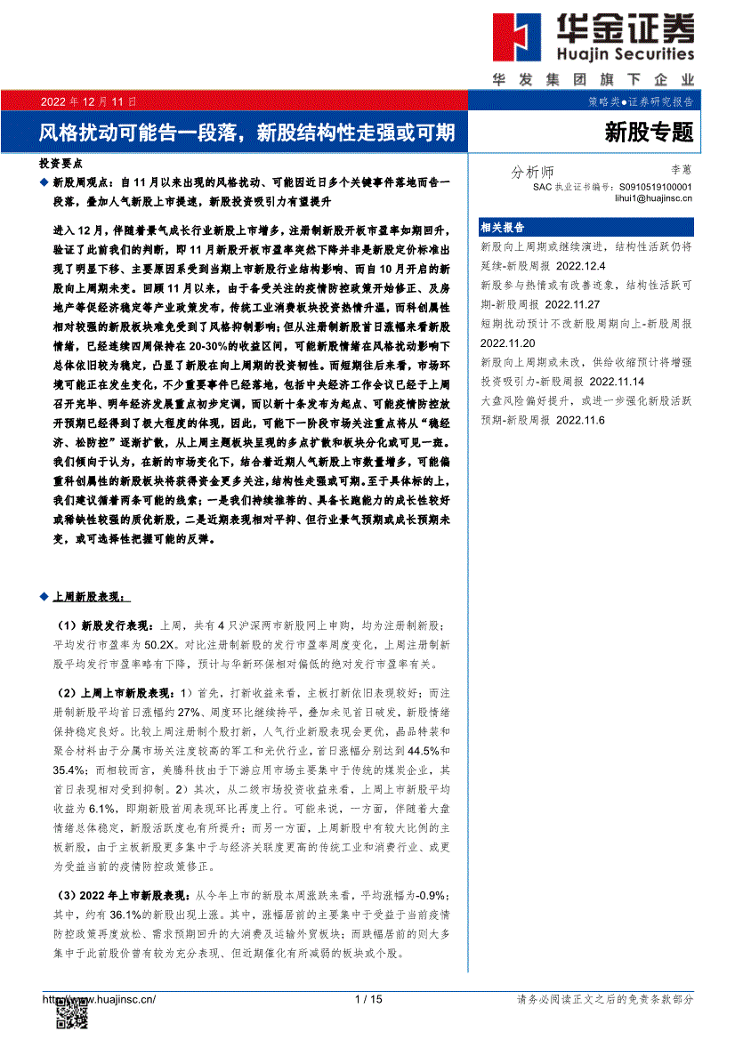 研报:华金证券-新股专题:风格扰动可能告一段落,新股结构性走强或可期-221211