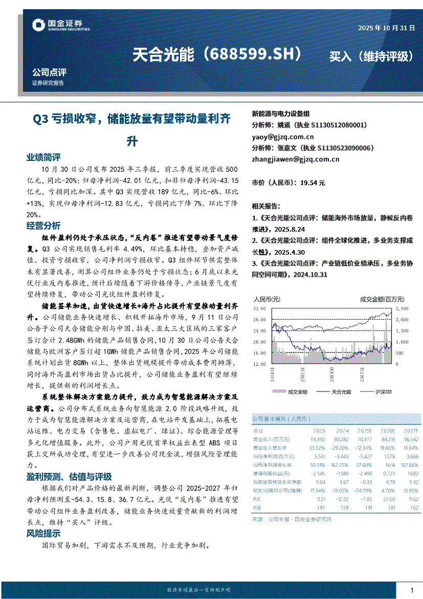 天合光能研报:国金证券-天合光能-688599-Q3亏损收窄,储能放量有望带动量利齐升-251031