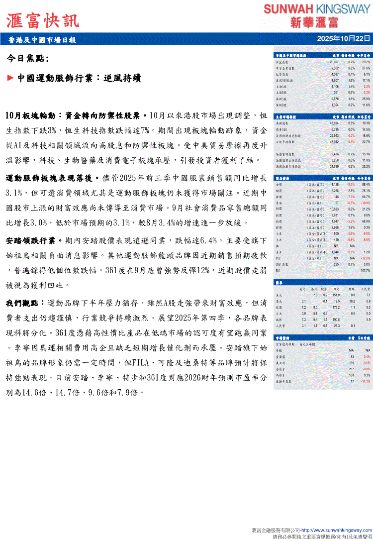 研报:新华汇富-滙富快訊:香港及中國市場日報-251022