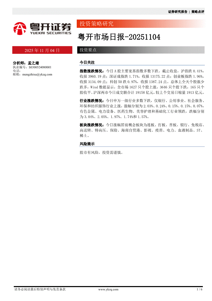 研报:粤开证券-粤开市场日报-251104