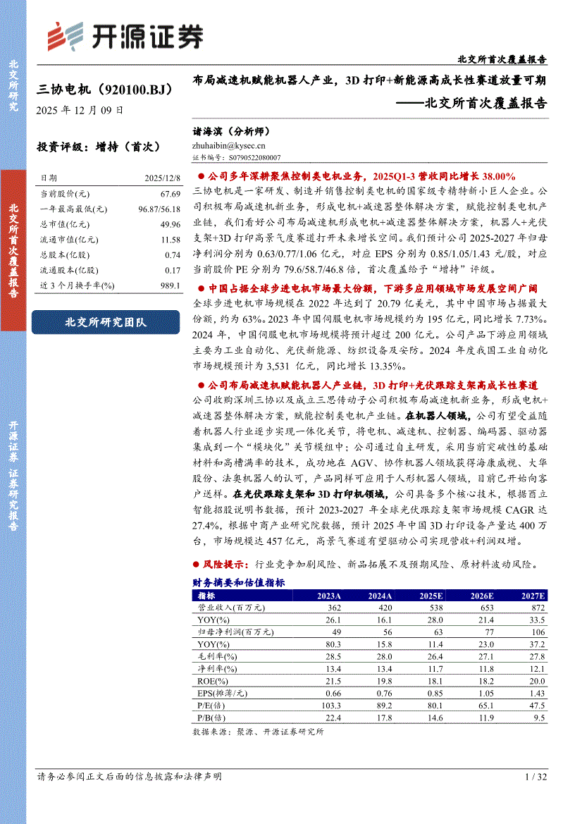 三协电机研报:开源证券-三协电机-920100-北交所首次覆盖报告:布局减速机赋能机器人产业,3D打印+新能源高成长性赛道放量可期-251209