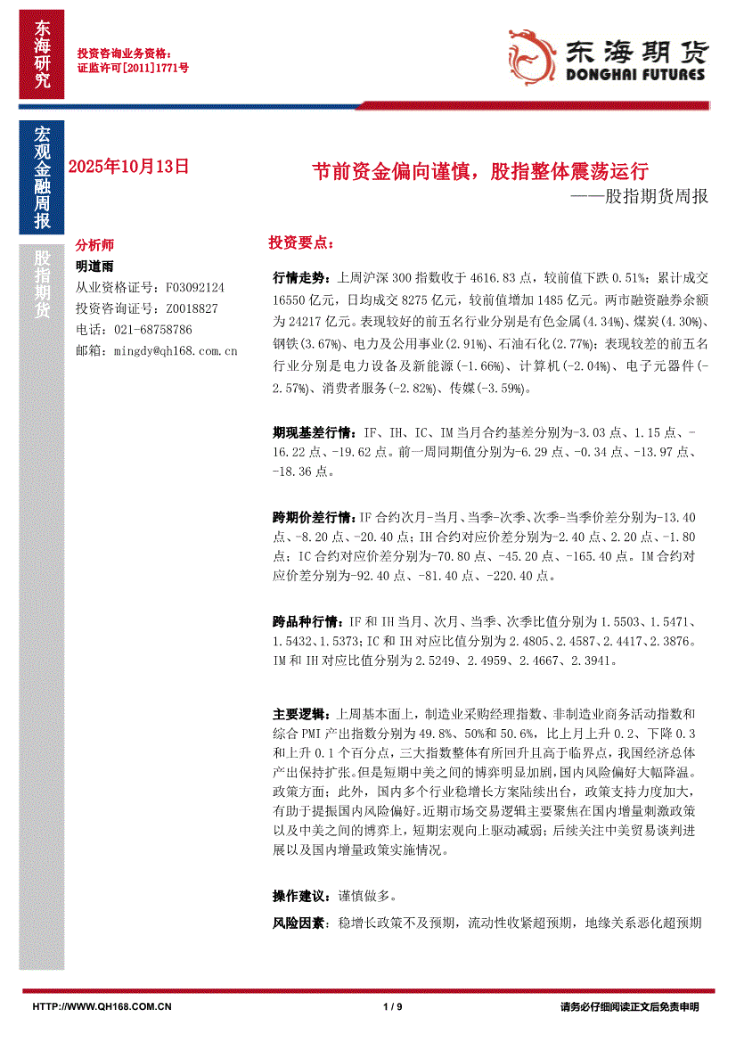 研报:东海期货-股指期货周报:节前资金偏向谨慎,股指整体震荡运行-251013