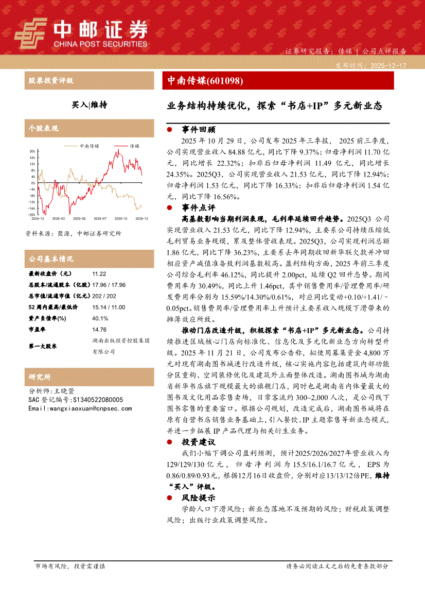 中南传媒研报:中邮证券-中南传媒-601098-业务结构持续优化,探索“书店+IP”多元新业态-251217