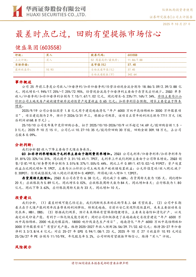 健盛集团研报:华西证券-健盛集团-603558-最差时点已过,回购有望提振市场信心-251027
