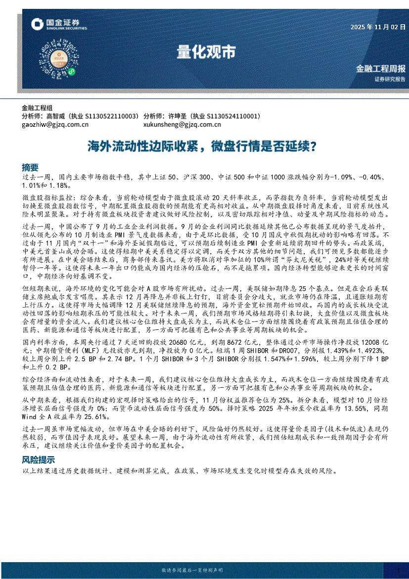 研报:国金证券-量化观市:海外流动性边际收紧,微盘行情是否延续?-251102