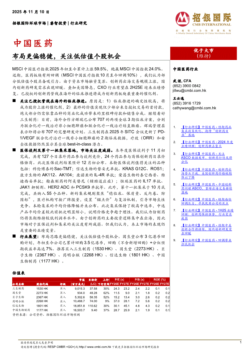 医药行业研报:招银国际-中国医药行业:布局更偏稳健,关注低估值个股机会-251110