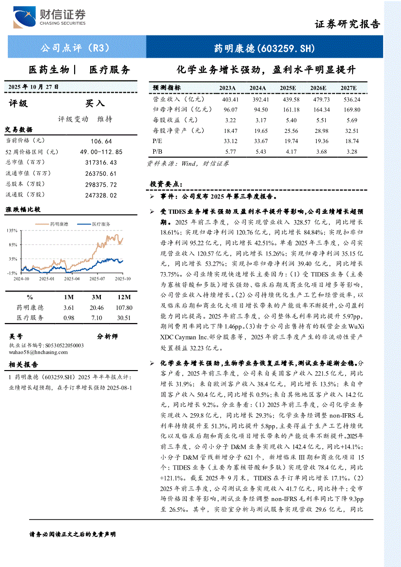 药明康德研报:财信证券-药明康德-603259-化学业务增长强劲,盈利水平明显提升-251027
