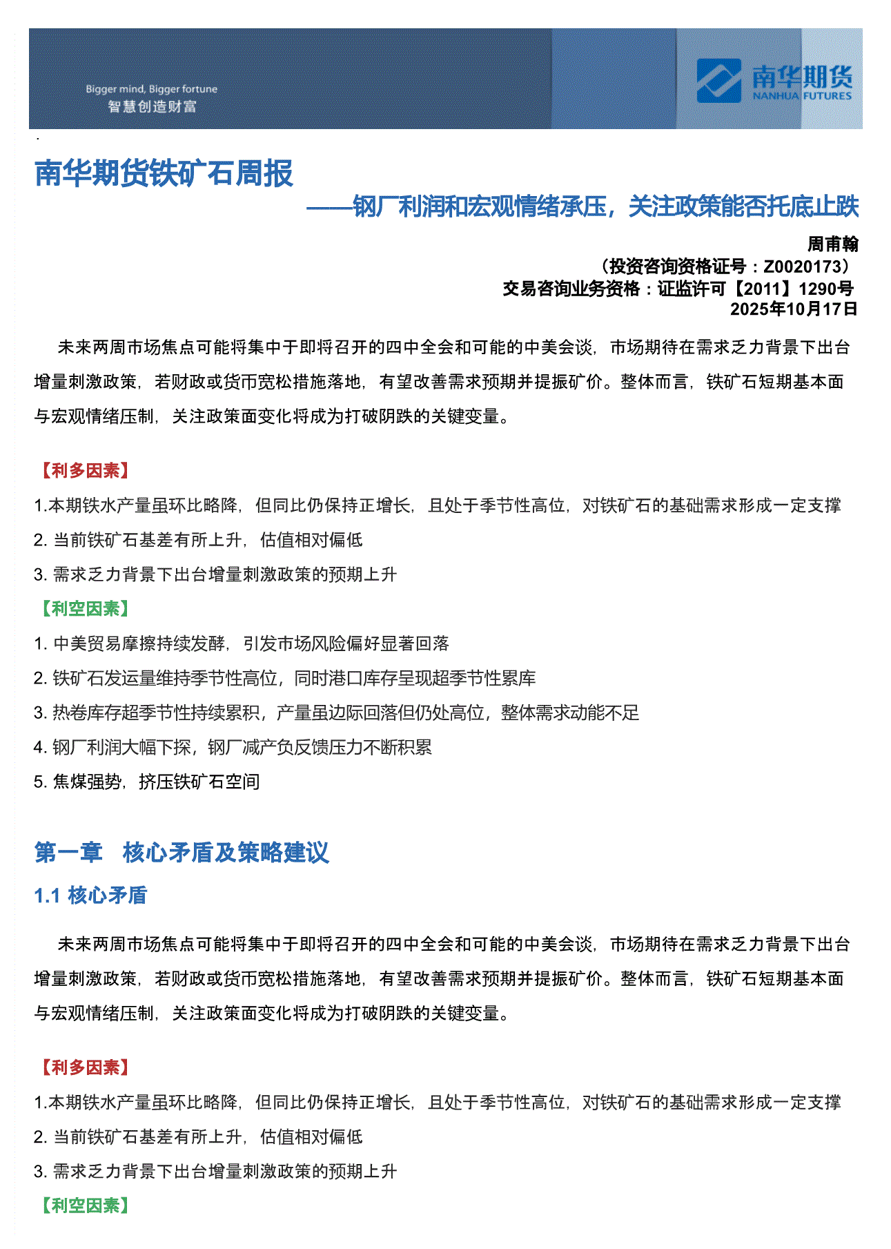 研报:南华期货-铁矿石周报:钢厂利润和宏观情绪承压,关注政策能否托底止跌-251017