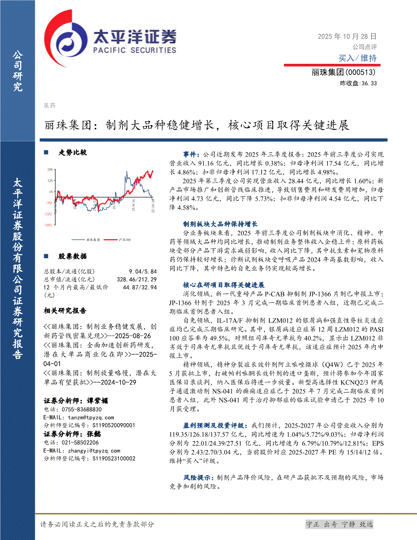 太平洋证券-丽珠集团-000513-制剂大品种稳健增长,核心项目取得关键进展-251028