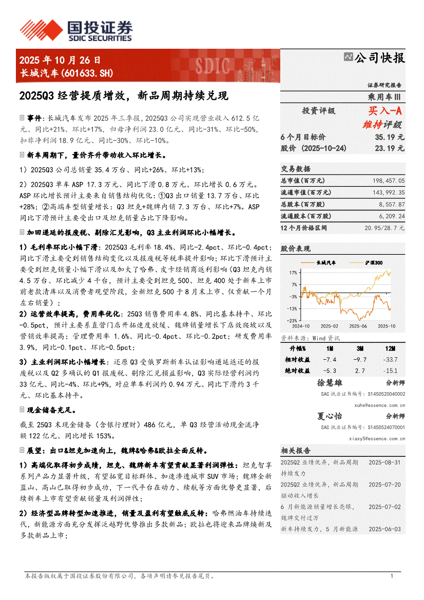 长城汽车研报:国投证券-长城汽车-601633-2025Q3经营提质增效,新品周期持续兑现-251026