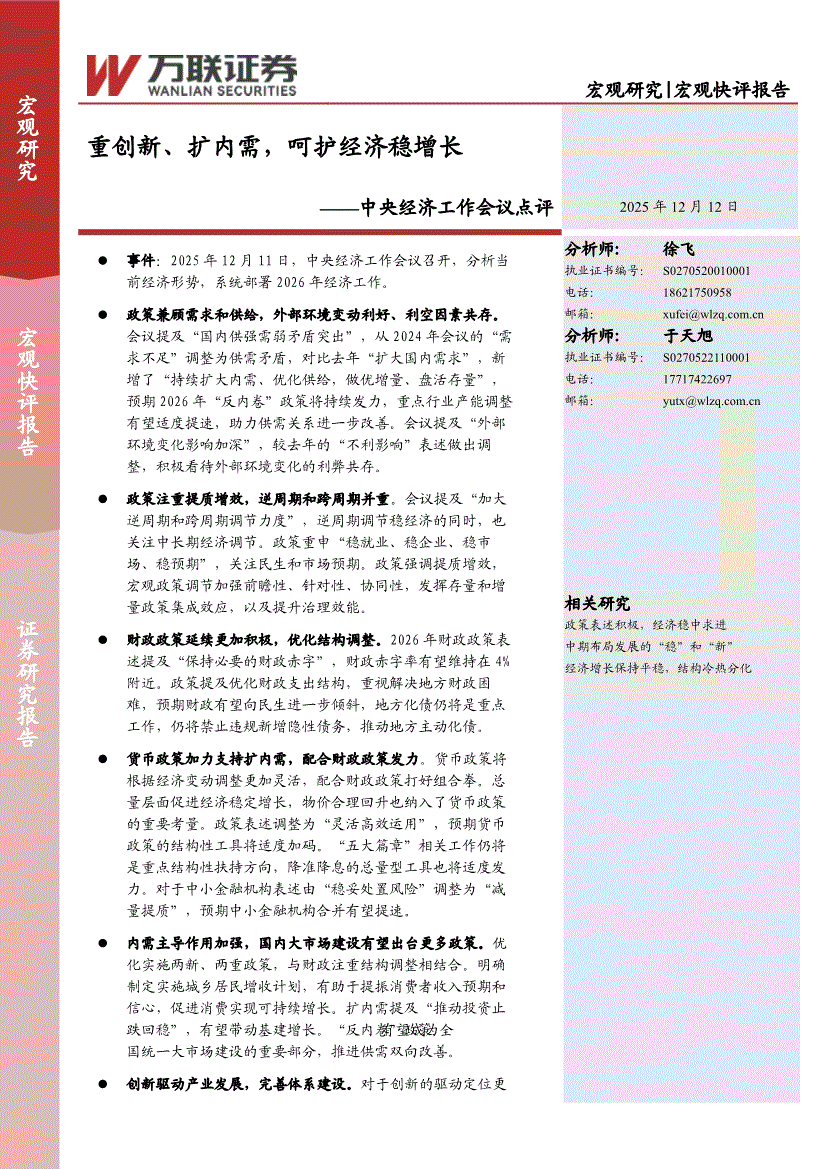研报:万联证券-中央经济工作会议点评:重创新、扩内需,呵护经济稳增长-251212