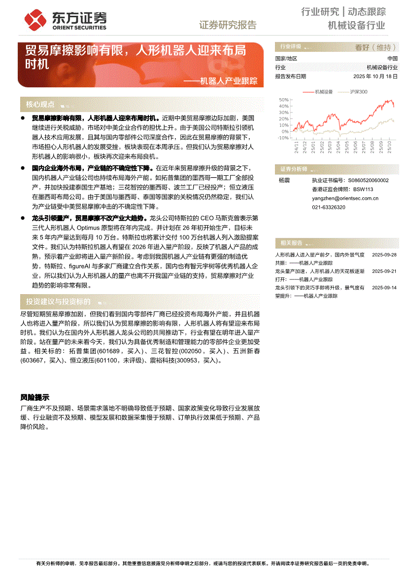 机械设备行业研报:东方证券-机械设备行业机器人产业跟踪:贸易摩擦影响有限,人形机器人迎来布局时机-251018