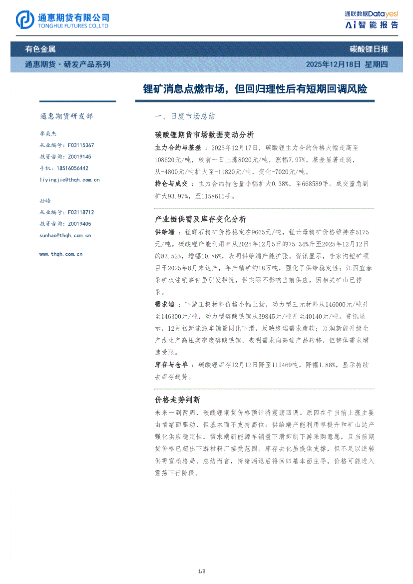 研报:通惠期货-碳酸锂日报:锂矿消息点燃市场,但回归理性后有短期回调风险-251218