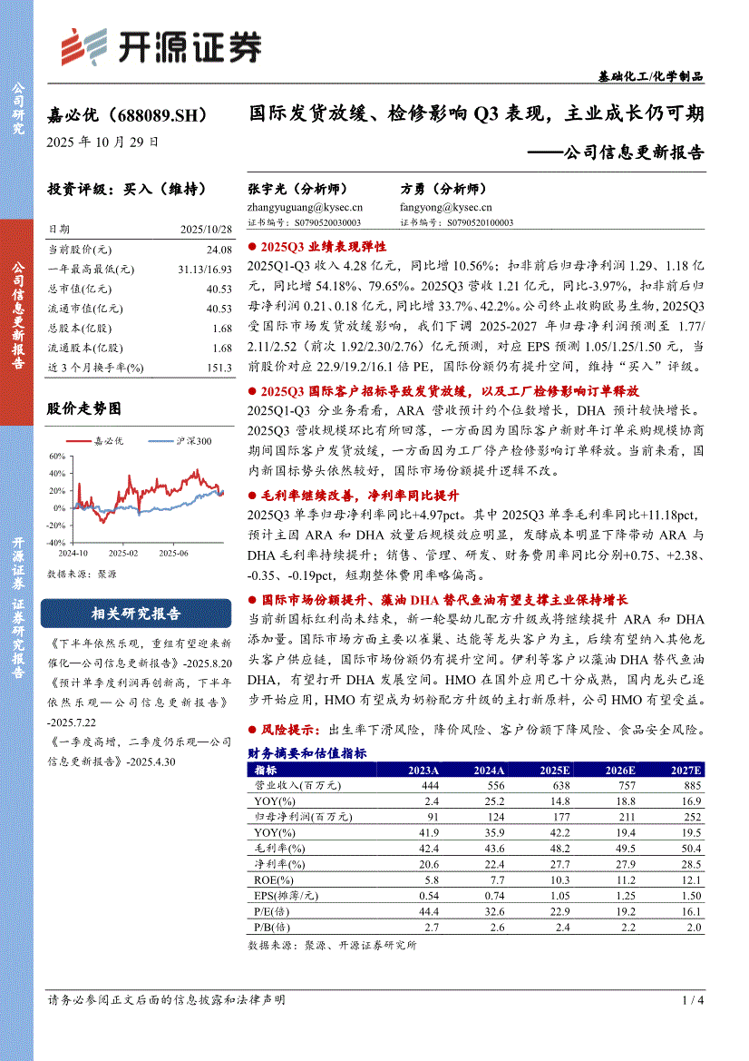 嘉必优研报:开源证券-嘉必优-688089-公司信息更新报告:国际发货放缓、检修影响Q3表现,主业成长仍可期-251029