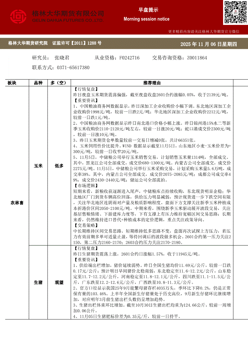 研报:格林大华期货-玉米生猪鸡蛋早盘提示-251106