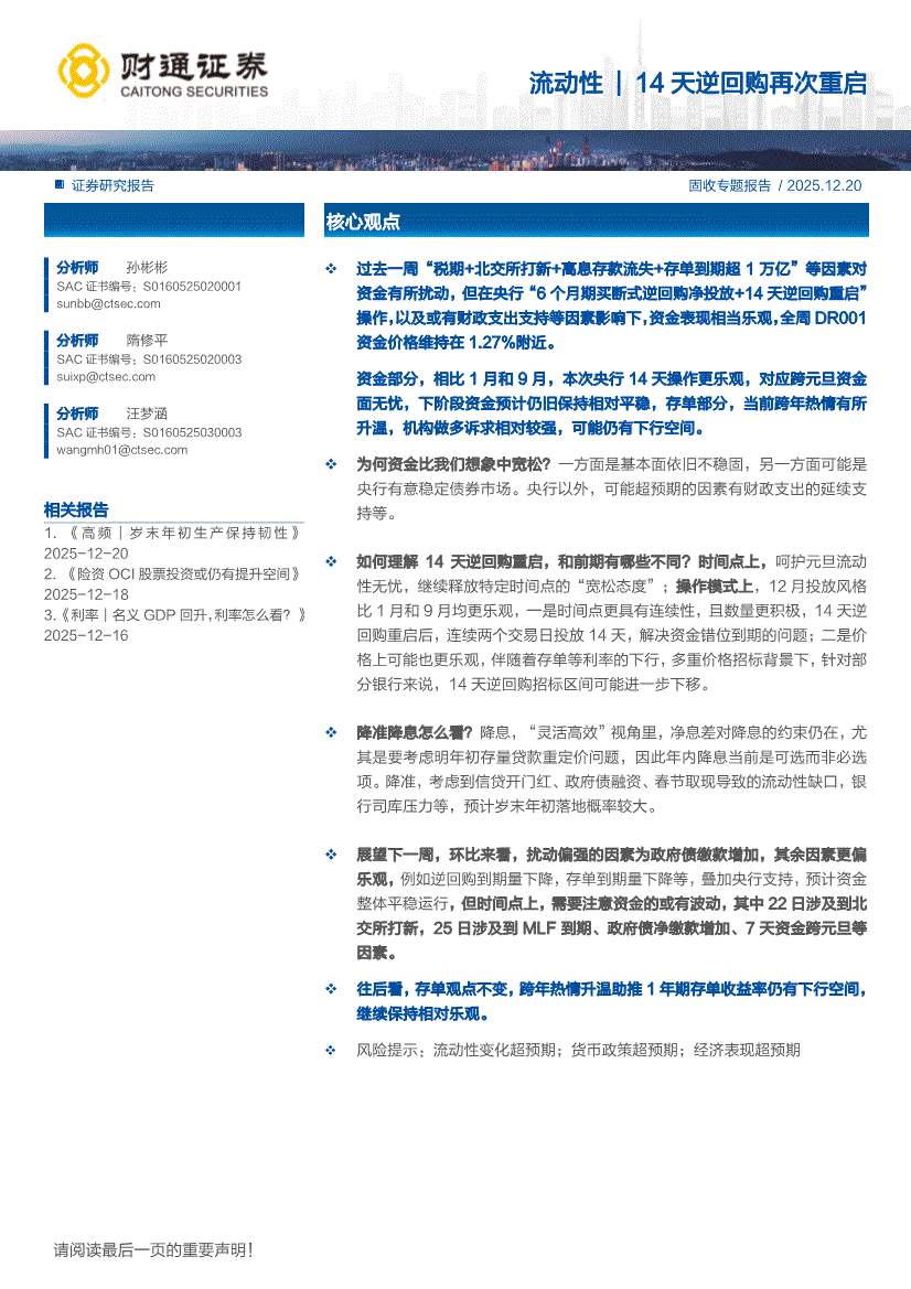 研报:财通证券-流动性| 14天逆回购再次重启-251220
