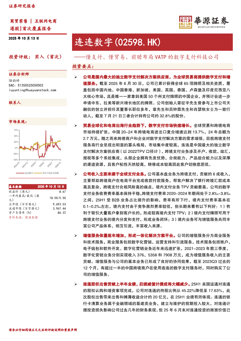 连连数字研报:华源证券-连连数字-2598.HK-懂支付、懂贸易、前瞻布局VATP的数字支付科技公司-251013
