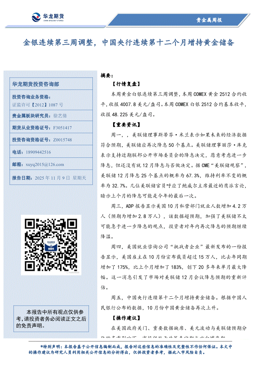 研报:华龙期货-贵金属周报:金银连续第三周调整,中国央行连续第十二个月增持黄金储备-251109
