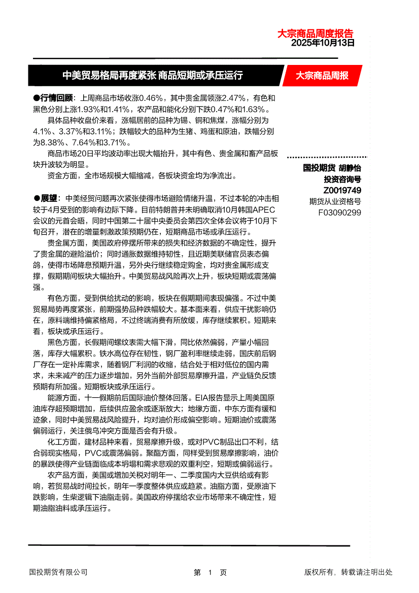 研报:国投期货-大宗商品周报:中美贸易格局再度紧张,商品短期或承压运行-251013