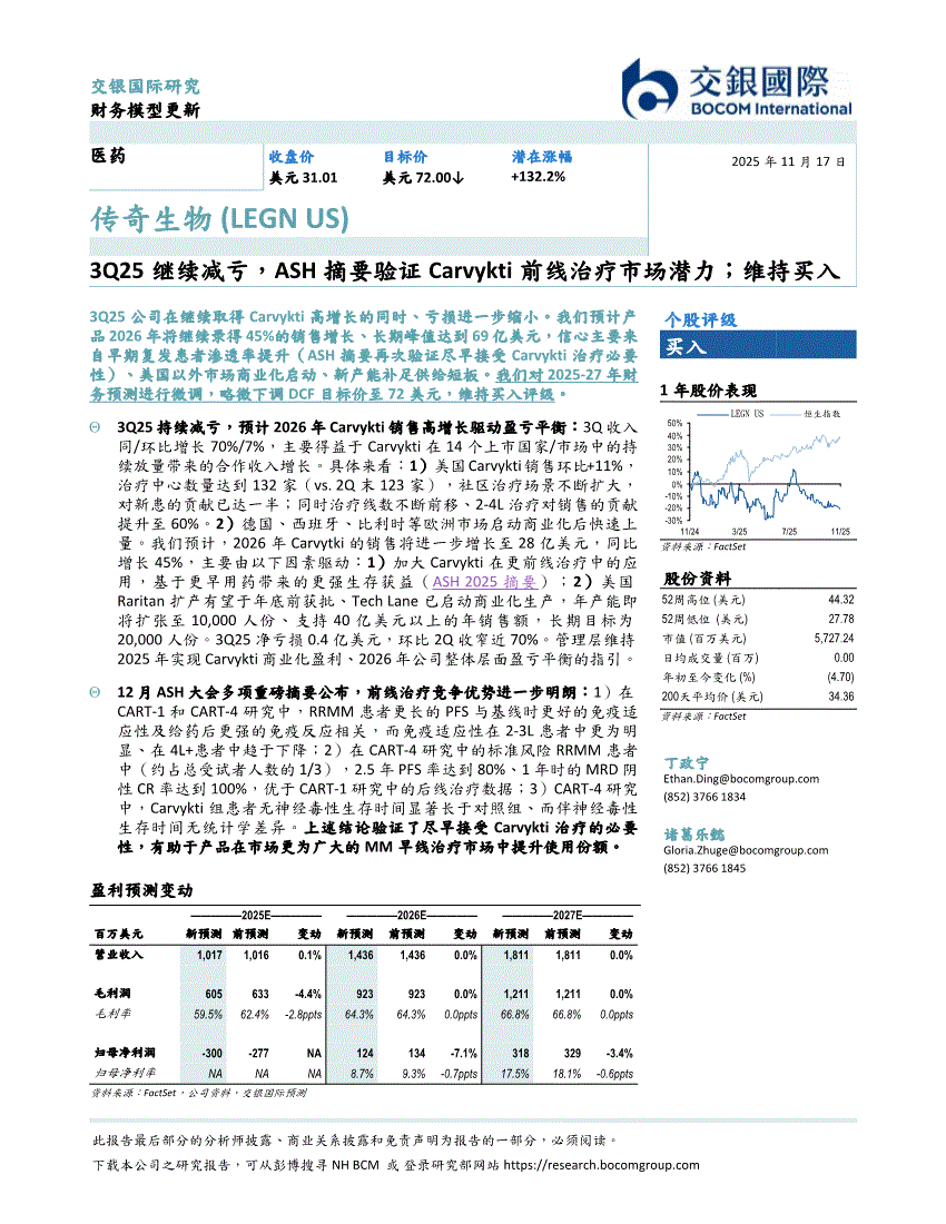 传奇生物研报:交银国际-传奇生物-LEGN.US-3Q25继续减亏,ASH摘要验证Carvykti前线治疗市场潜力;维持买入-251117