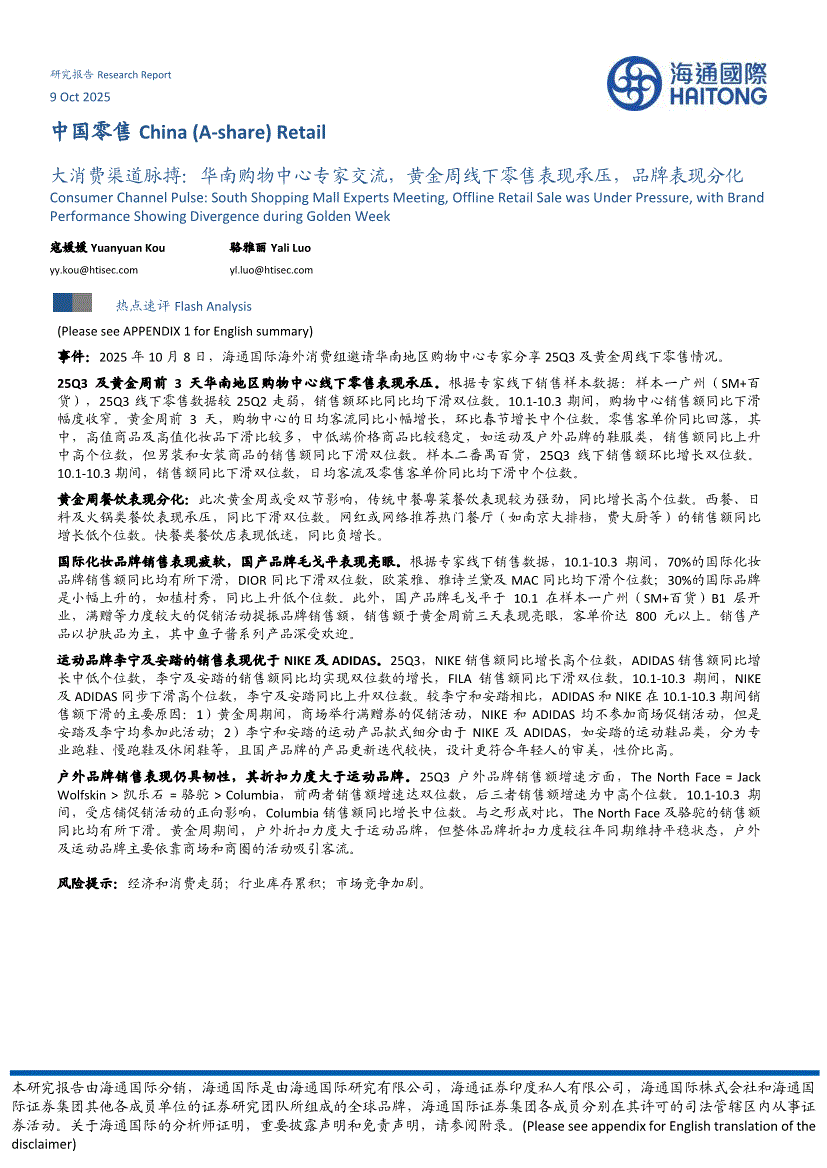 零售行业研报:海通国际-中国零售行业大消费渠道脉搏:华南购物中心专家交流,黄金周线下零售表现承压,品牌表现分化-251009
