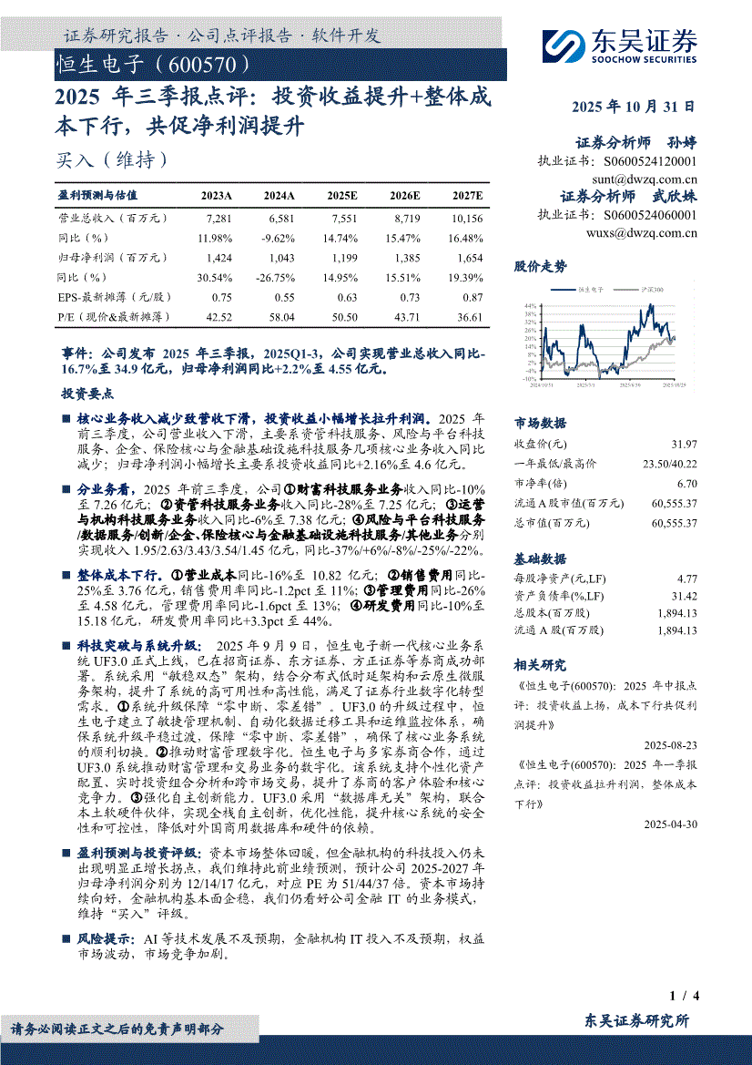 恒生电子研报:东吴证券-恒生电子-600570-2025年三季报点评:投资收益提升+整体成本下行,共促净利润提升-251031