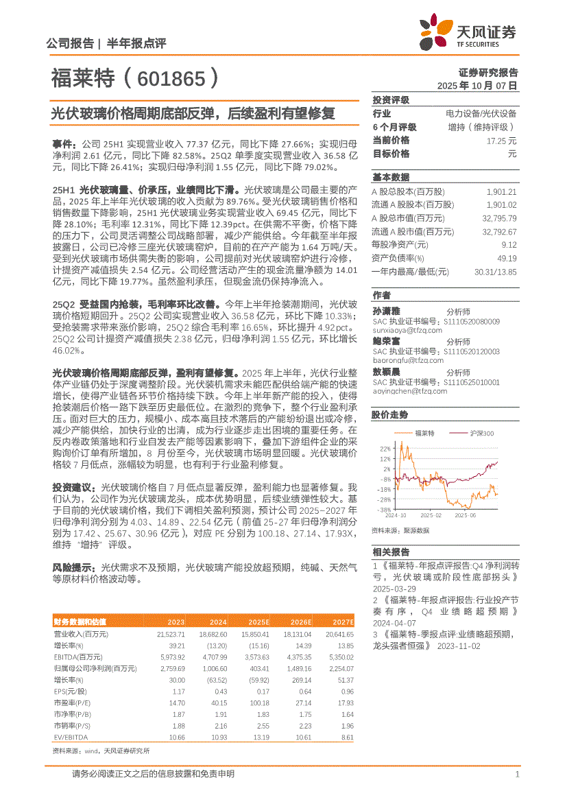 福莱特研报:天风证券-福莱特-601865-光伏玻璃价格周期底部反弹,后续盈利有望修复-251007