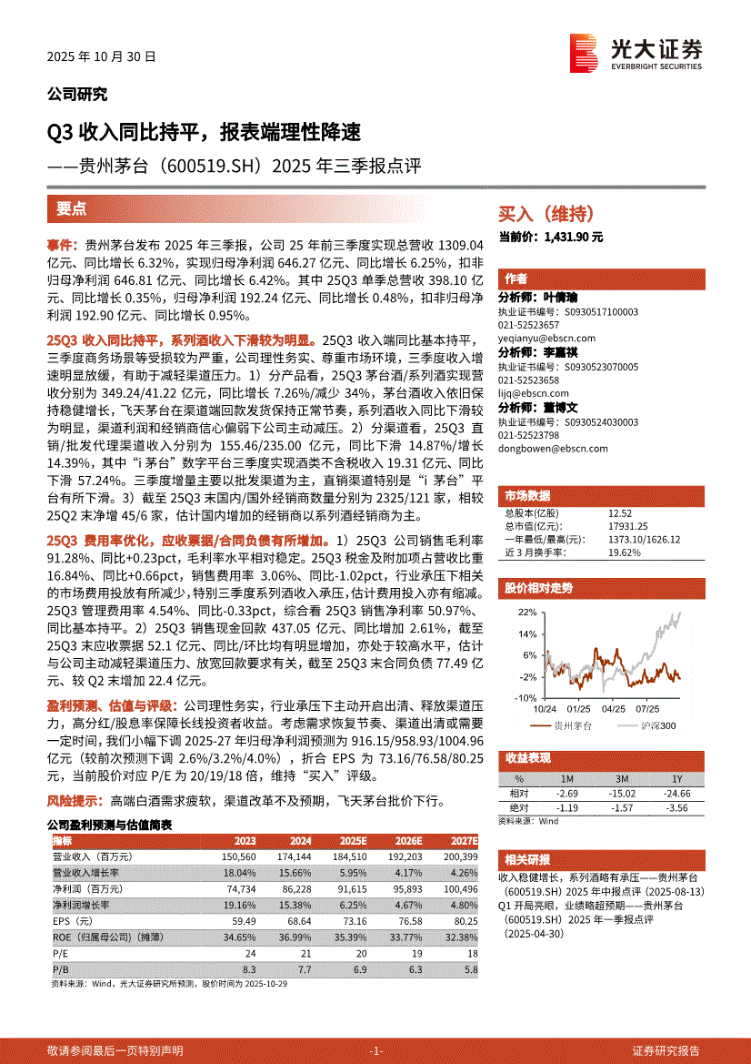贵州茅台研报:光大证券-贵州茅台-600519-2025年三季报点评:Q3收入同比持平,报表端理性降速-251030