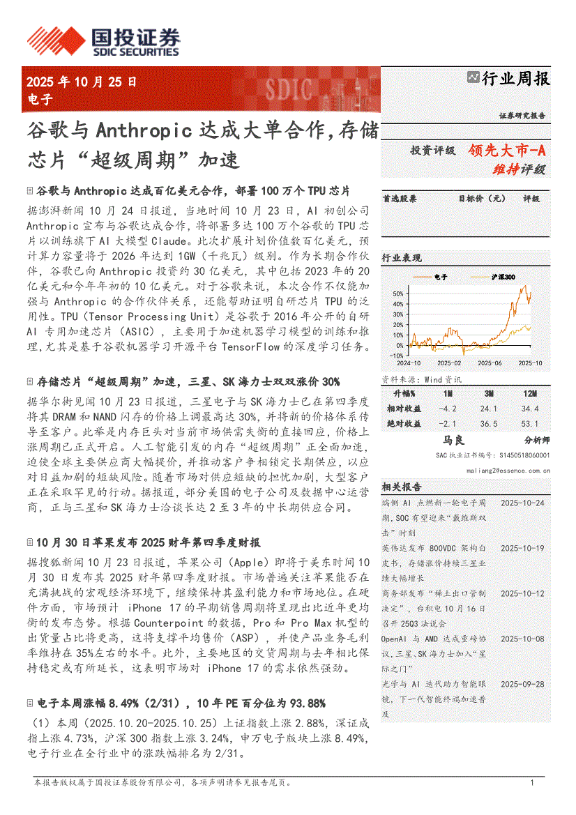 电子行业研报:国投证券-电子行业周报:谷歌与Anthropic达成大单合作,存储芯片“超级周期”加速-251025