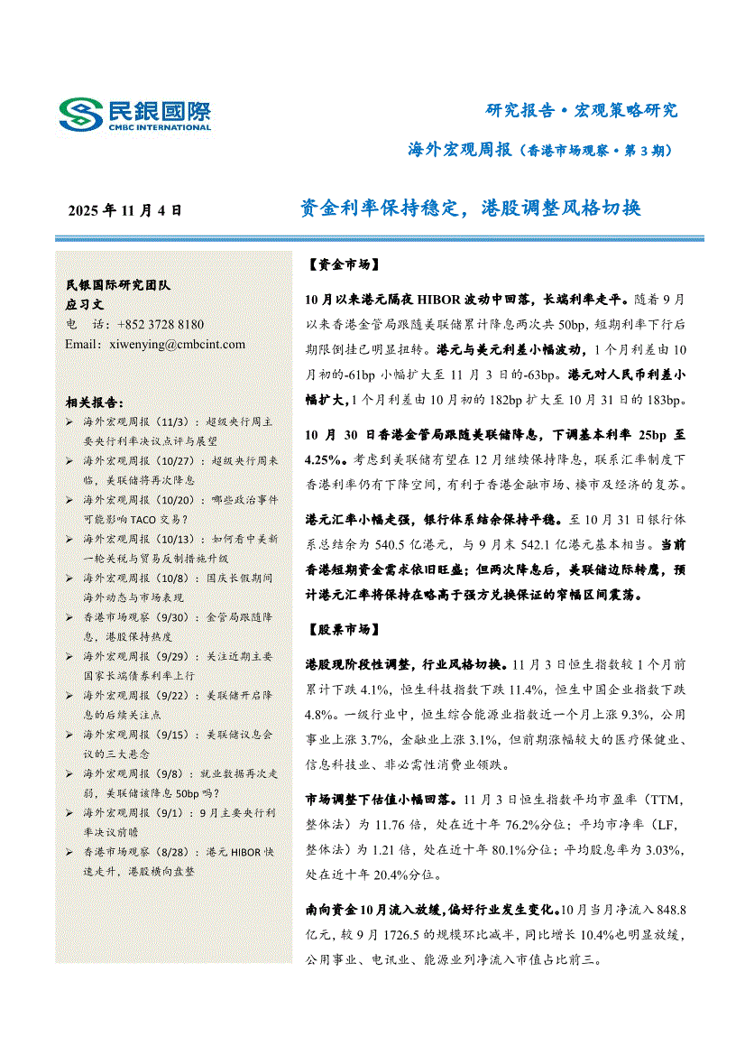 研报:民银国际-海外宏观周报(香港市场观察·第3期) :资金利率保持稳定,港股调整风格切换-251104