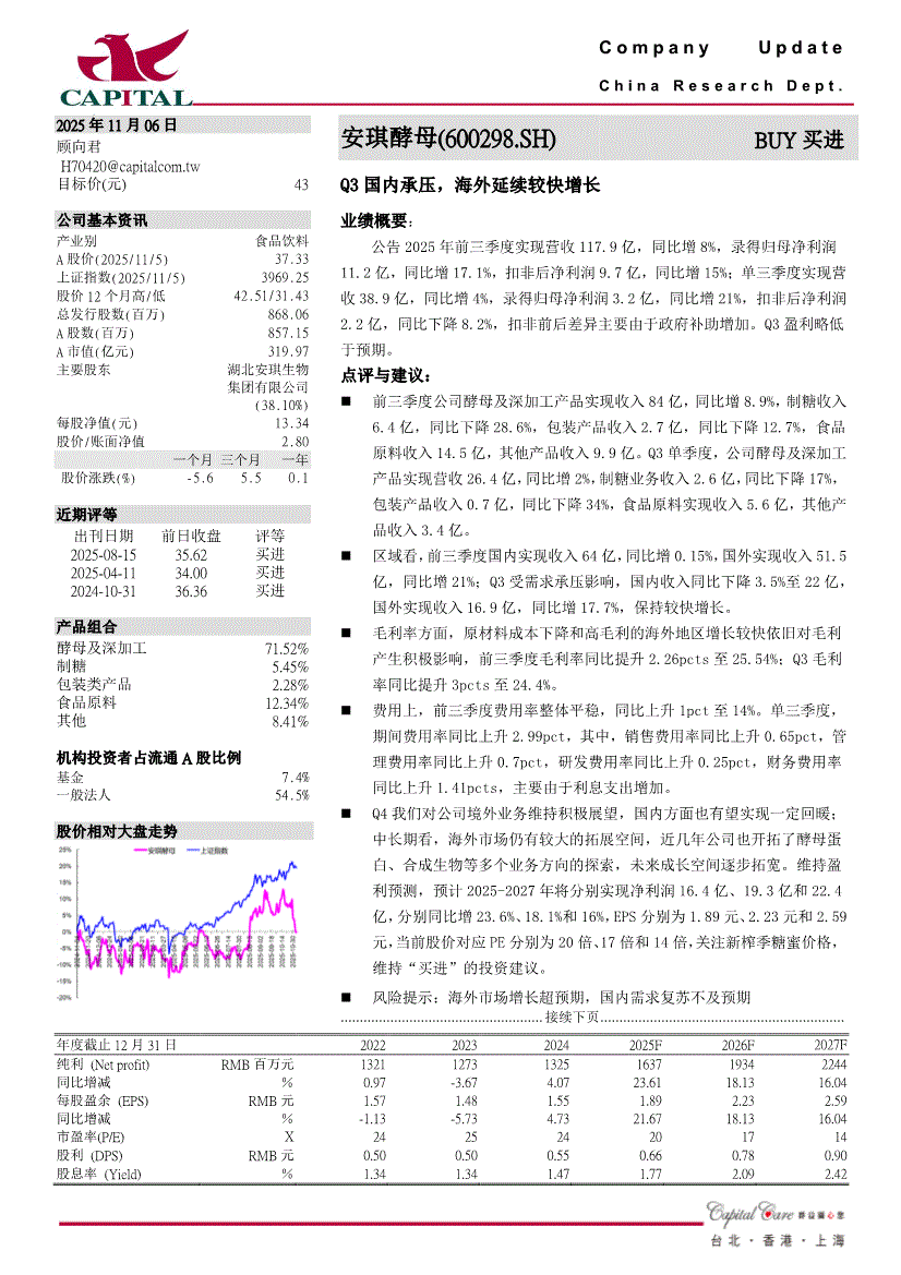 安琪酵母研报:群益证券-安琪酵母-600298-Q3国内承压,海外延续较快增长-251106