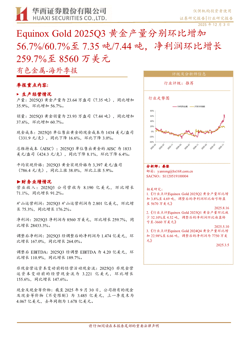 有色金属行业研报:华西证券-有色金属行业~海外季报:Equinox Gold 2025Q3黄金产量分别环比增加56.7%/60.7%至7.35吨/7.44吨,净利润环比增长259.7%至8560万美元-251203