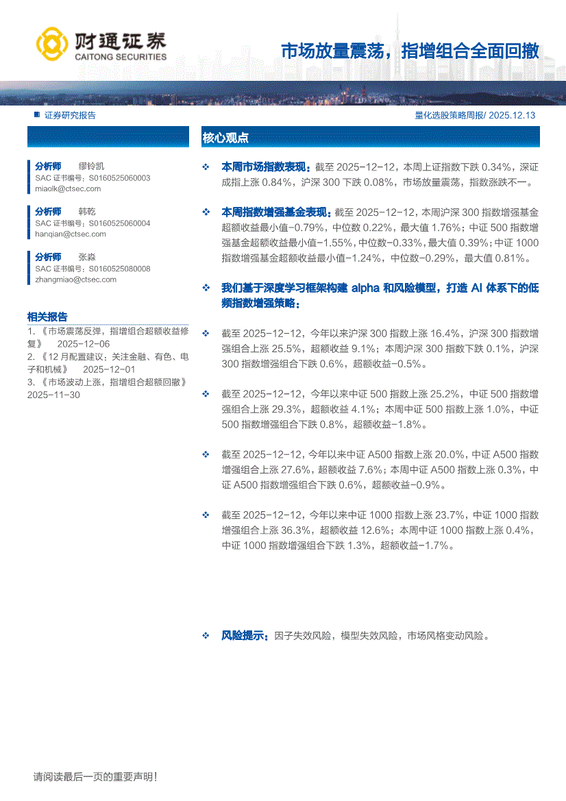 研报:财通证券-市场放量震荡,指增组合全面回撤-251213