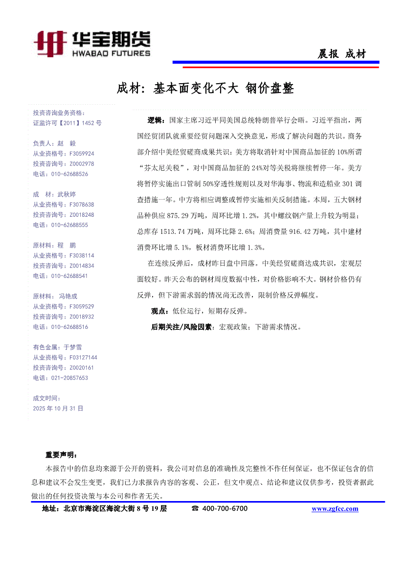 研报:华宝期货-成材晨报:基本面变化不大,钢价盘整-251031