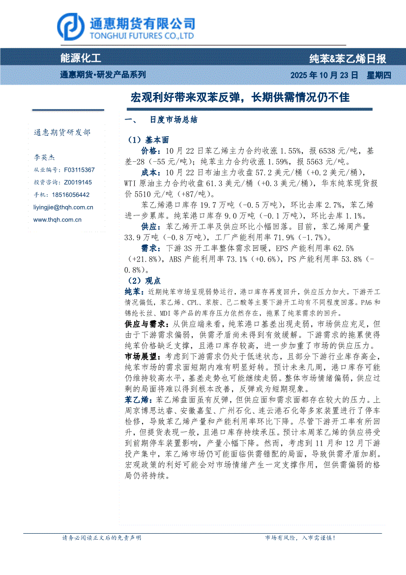 研报:通惠期货-纯苯&苯乙烯日报:宏观利好带来双苯反弹,长期供需情况仍不佳-251023