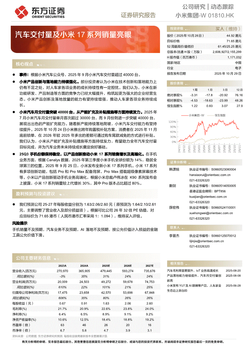 小米集团~W研报:东方证券-小米集团~W-1810.HK-汽车交付量及小米17系列销量亮眼-251029