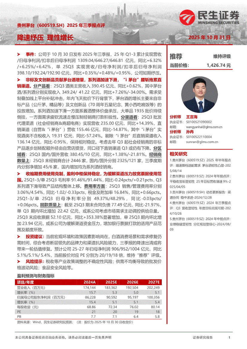 贵州茅台研报:民生证券-贵州茅台-600519-2025年三季报点评:降速纾压,理性增长-251031