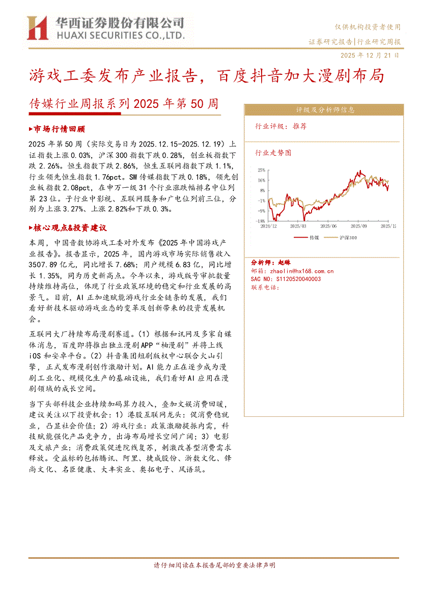 传媒行业研报:华西证券-传媒行业周报系列2025年第50周:游戏工委发布产业报告,百度抖音加大漫剧布局-251221