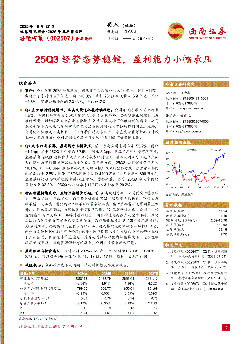涪陵榨菜研报:西南证券-涪陵榨菜-002507-25Q3经营态势稳健,盈利能力小幅承压-251027