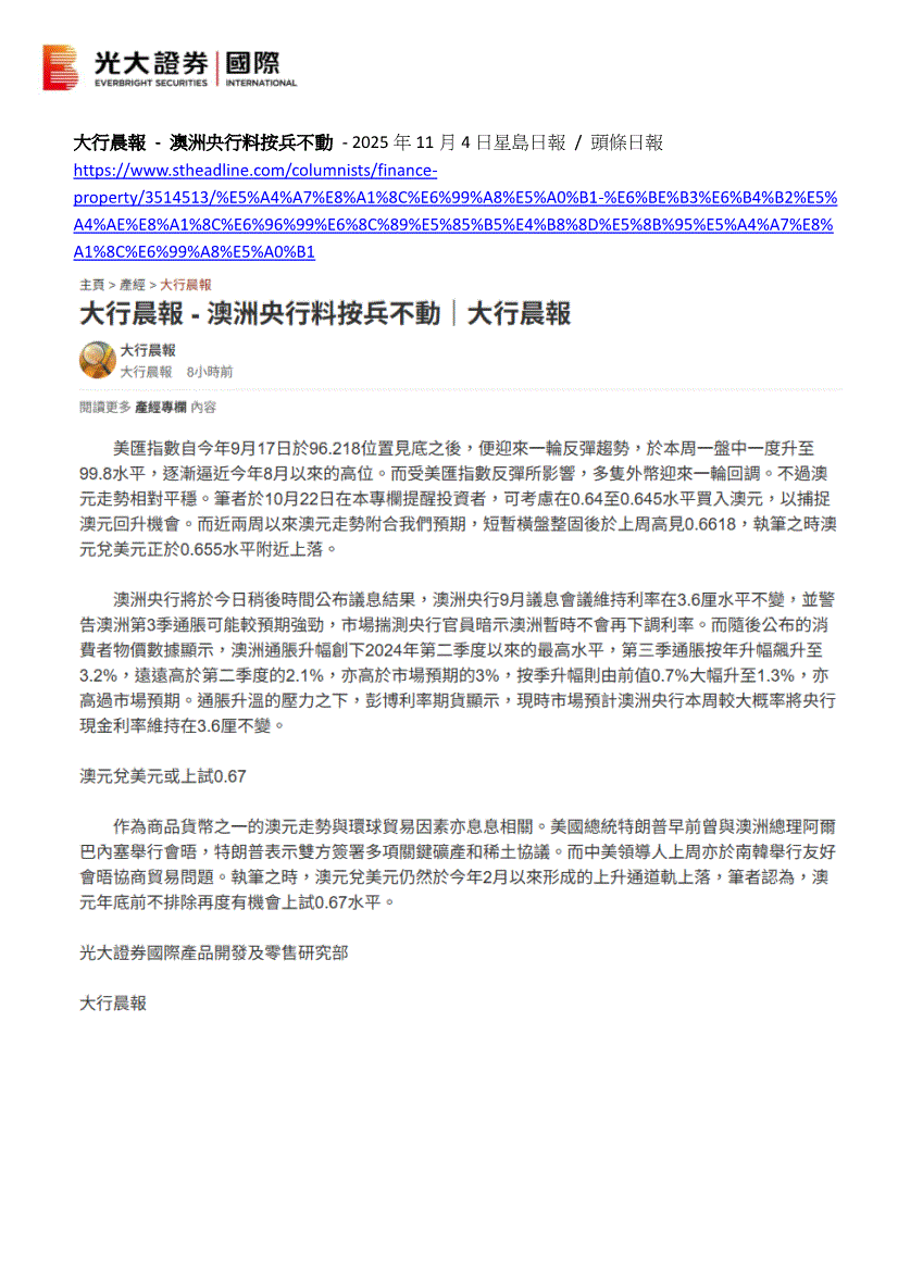 研报:光大证券(国际)-大行晨报:澳洲央行料按兵不动-251104