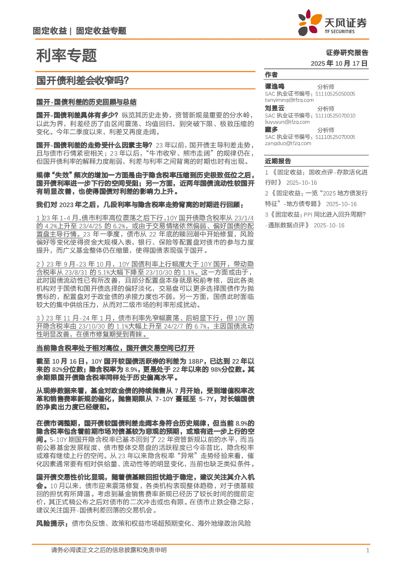 研报:天风证券-利率专题:国开债利差会收窄吗?-251017