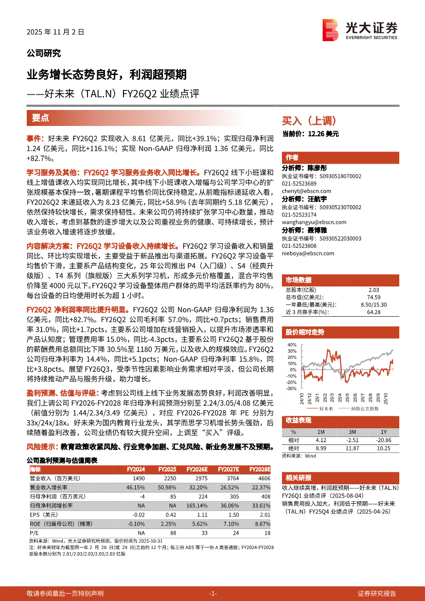 好未来研报:光大证券-好未来-TAL.US-FY26Q2业绩点评:业务增长态势良好,利润超预期-251102