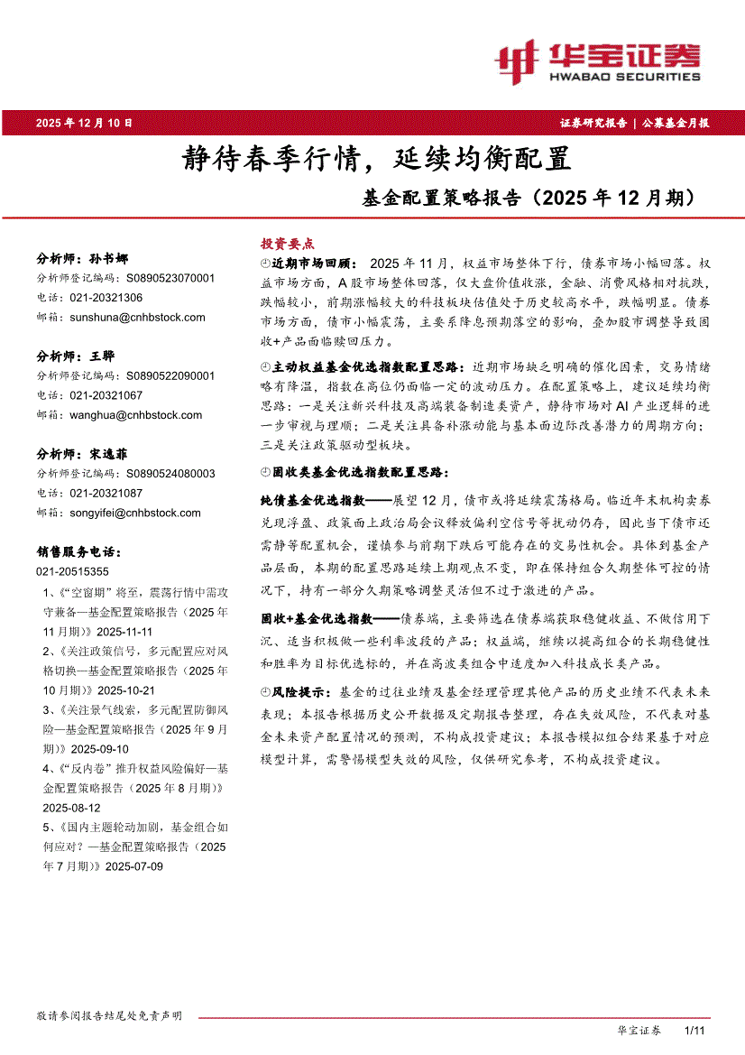 研报:华宝证券-基金配置策略报告(2025年12月期):静待春季行情,延续均衡配置-251210