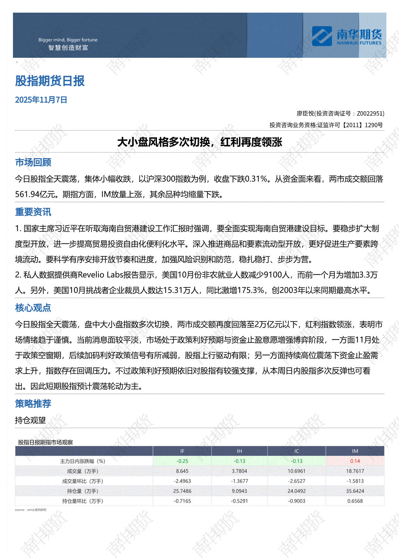 研报:南华期货-股指期货日报:大小盘风格多次切换,红利再度领涨-251107