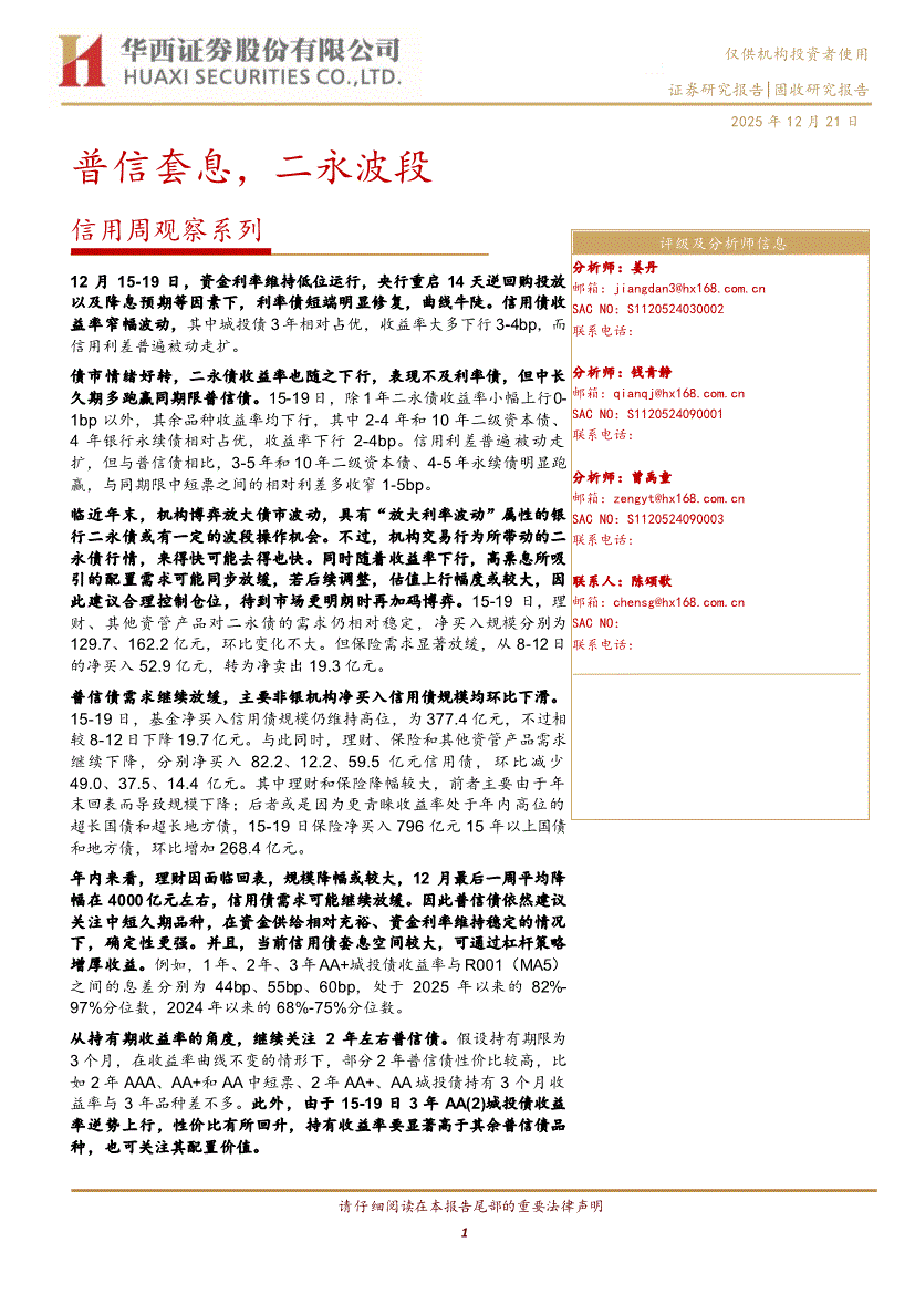 研报:华西证券-信用周观察系列:普信套息,二永波段-251221